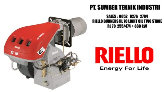 Burner Riello RL 70 adalah pembakar minyak ringan (solar) dua tahap yang dirancang untuk aplikasi industri seperti boiler, pemanas termal, insinerator, dan pengering, dengan kapasitas antara 40-70 kg/jam atau setara dengan 474-830 kW. Burner ini memiliki panel kontrol berbasis mikroprosesor yang menampilkan status dan penyebab kesalahan, serta dilengkapi dengan dua nozel untuk operasi dua tahap.